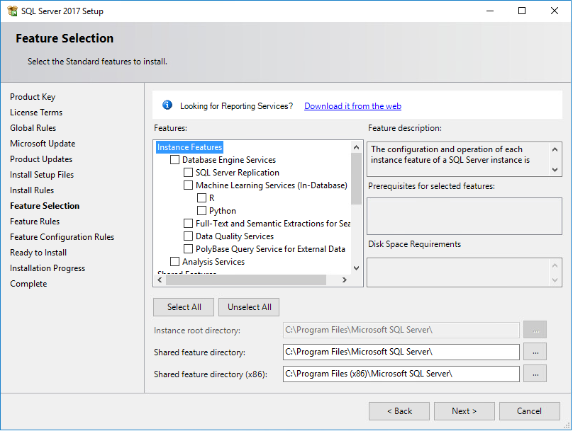 In the Instance root directory, Shared feature directory, and Shared feature directory (x86) fields, specify the path where you want to SQL instance to reside, then click Next.