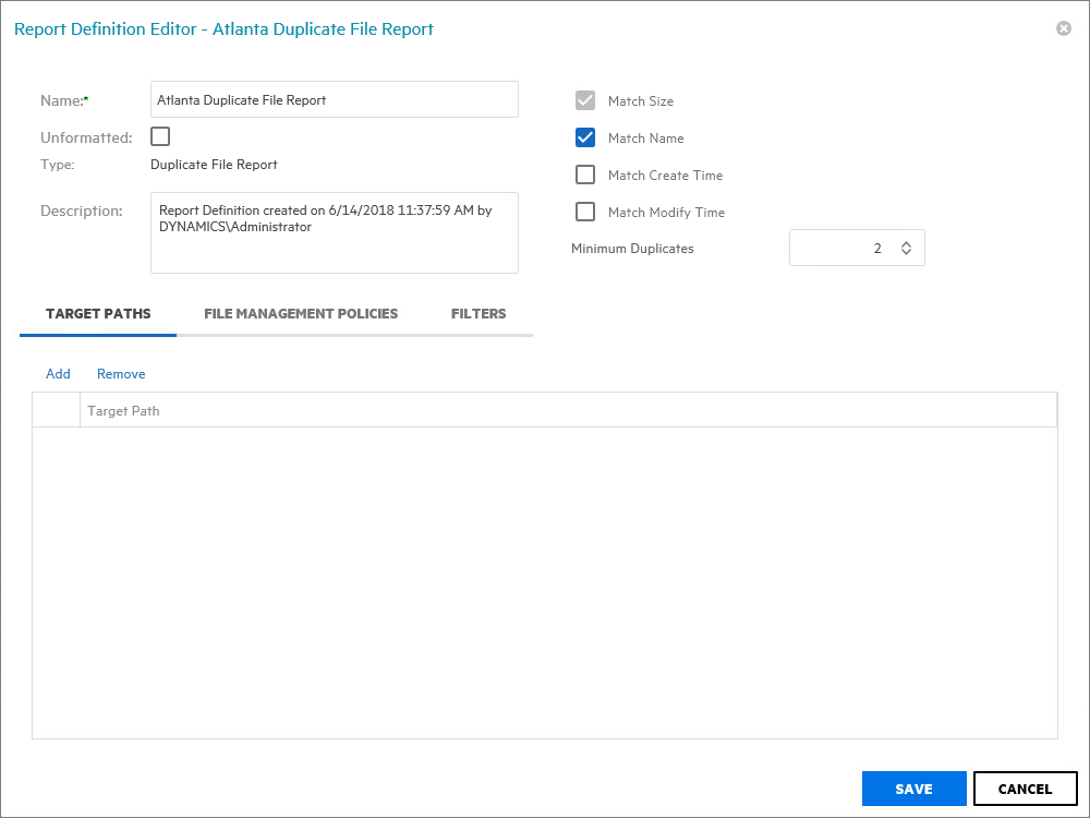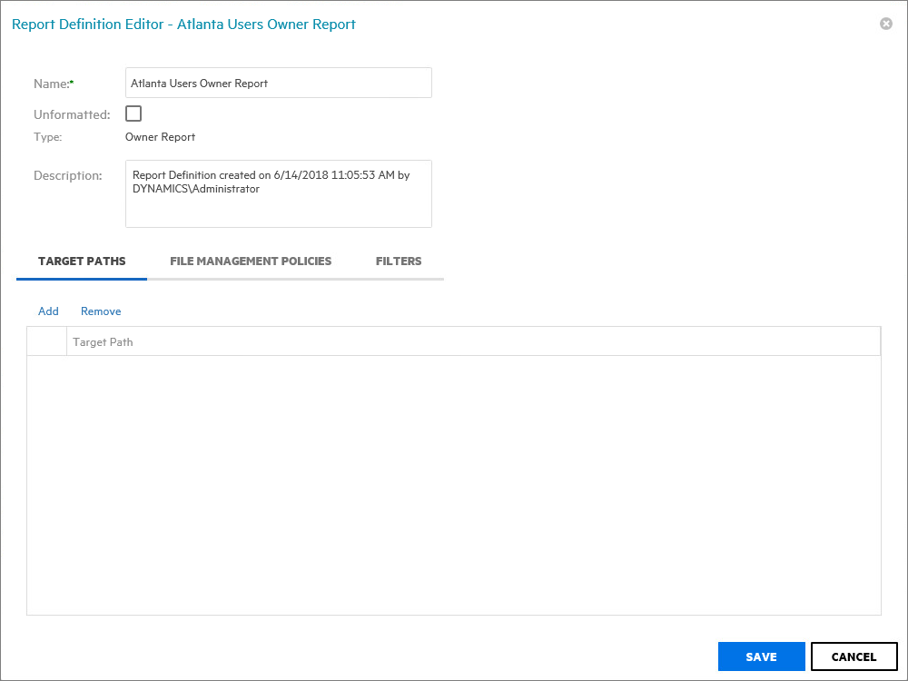 From the Target Paths tab, click Add, then browse to and specify the file paths you want included in the report and click OK.