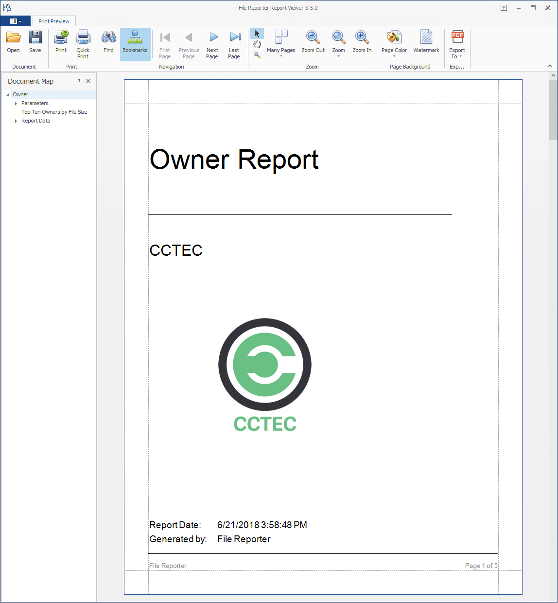 File Reporter lets you present built-in reports in various formats including PDF, Microsoft Excel, RTF, HTML, TXT, and CSV. The product also includes built-in graphs for certain report types.