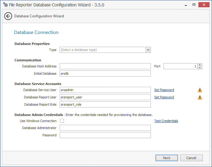Test Credentials: Clicking this lets you quickly confirm that the entries in the Database Service Accounts region are accurate before advancing in the wizard.