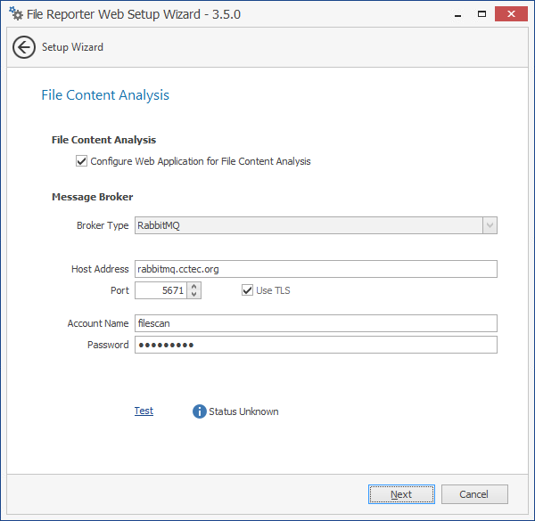 Configure Web Application for File Content Analysis: If you are not set up for File Content scanning or your message broker is not yet configured, deselect this check box. Deselecting this allows you to skip the File Content Analysis step as well as the following File Content Search Results step.