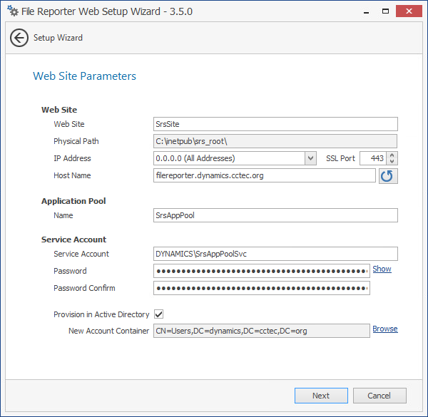 Web Site: The default name for the File Reporter Web site. If the default name does not conform to your organization’s naming standards, you can edit it.