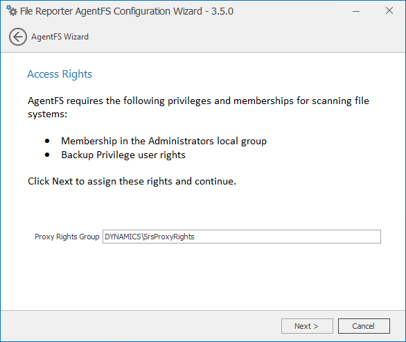 This page lets you establish AgentFS as a member of the Administrators local group and the ability to back up to the SrsProxyRights group.