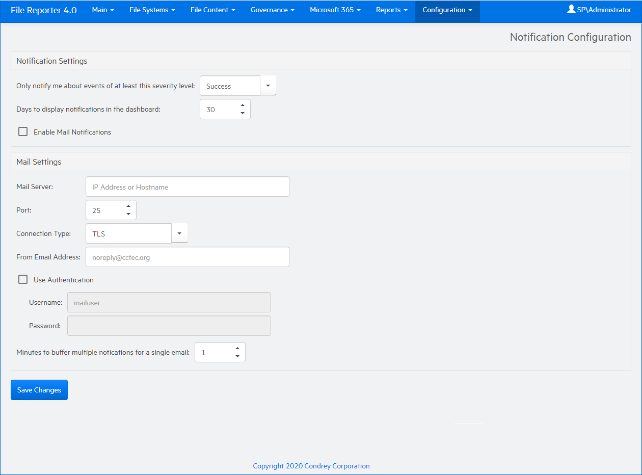 Minutes to buffer multiple notifications in a single email: File Reporter can consolidate messages into a single email notification. If you change this setting to 5, File Reporter consolidates all of the events that took place in 5 minutes and emails you a notification.