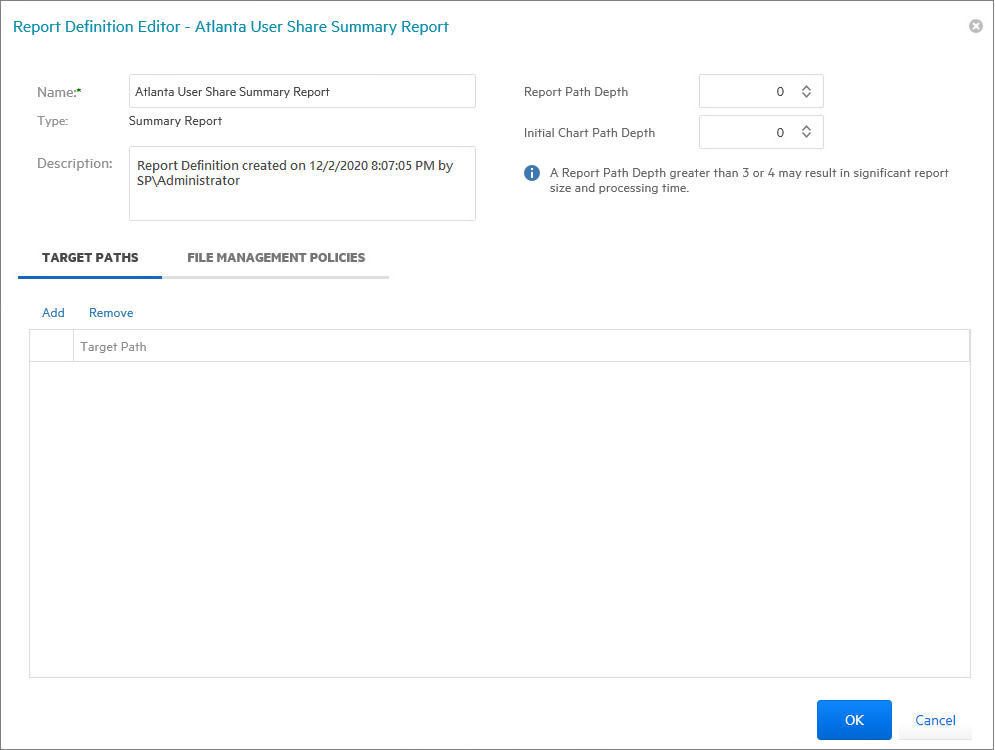 In the Initial Chart Path Depth field, specify the initial path depth for inclusion in the Top Ten Folders by Size chart that is displayed in the report header section.
