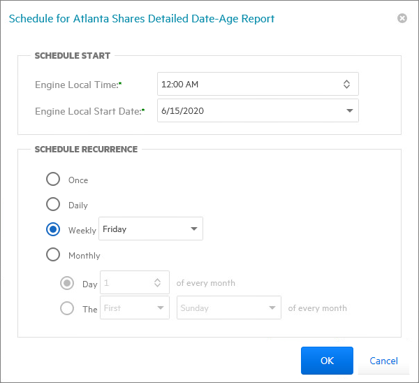 Be aware that entering a date does not mean that the report generates on that date. If the Engine Local Start Date is set for today, which is a Monday, but the Schedule Recurrence setting is set for Weekly on Sunday, the report does not generate until Sunday.