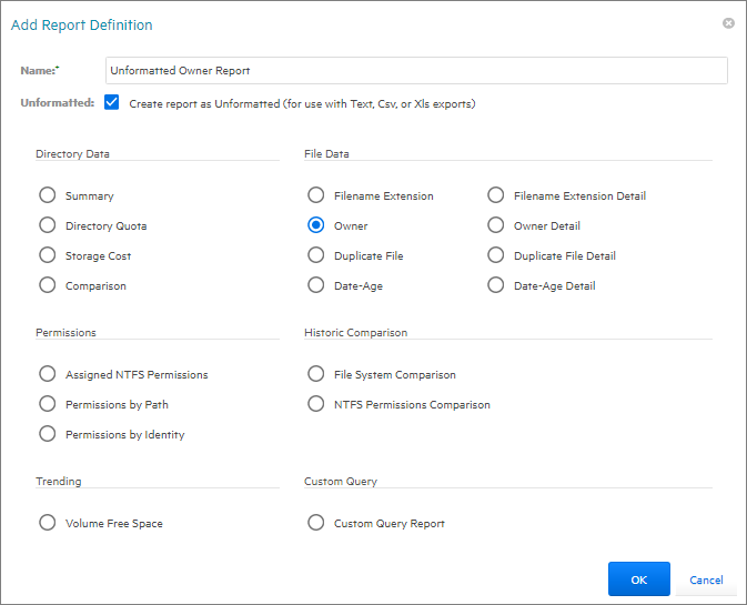 File Reporter can generate an unformatted report for all built-in report types except for Summary reports.