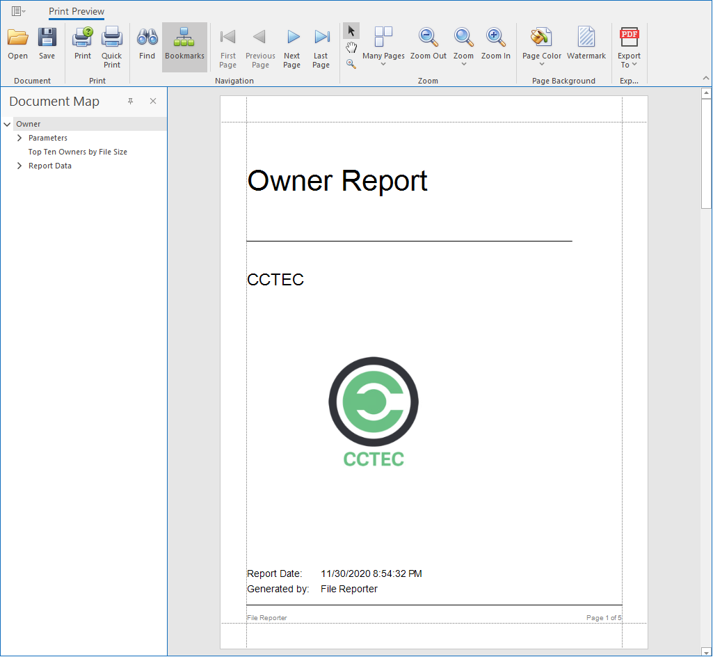 File Reporter lets you present built-in reports in various formats including PDF, Microsoft Excel, RTF, HTML, TXT, and CSV. The product also includes built-in graphs for certain report types.