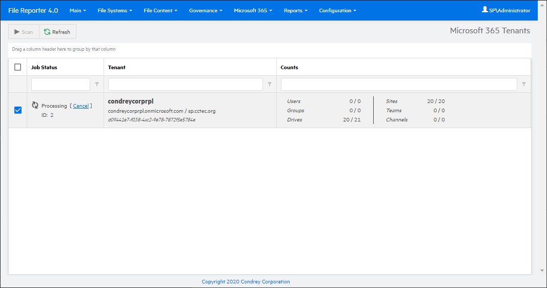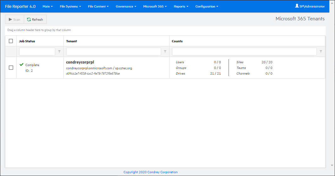 Scanning your Microsoft 365 tenant identifies all users and groups, the associated drives, sites and associated libraries, teams and their associated libraries, and channels and their associated libraries. A tenant scan includes details pertaining to the file system structure, individual files, and file and folder permissions.