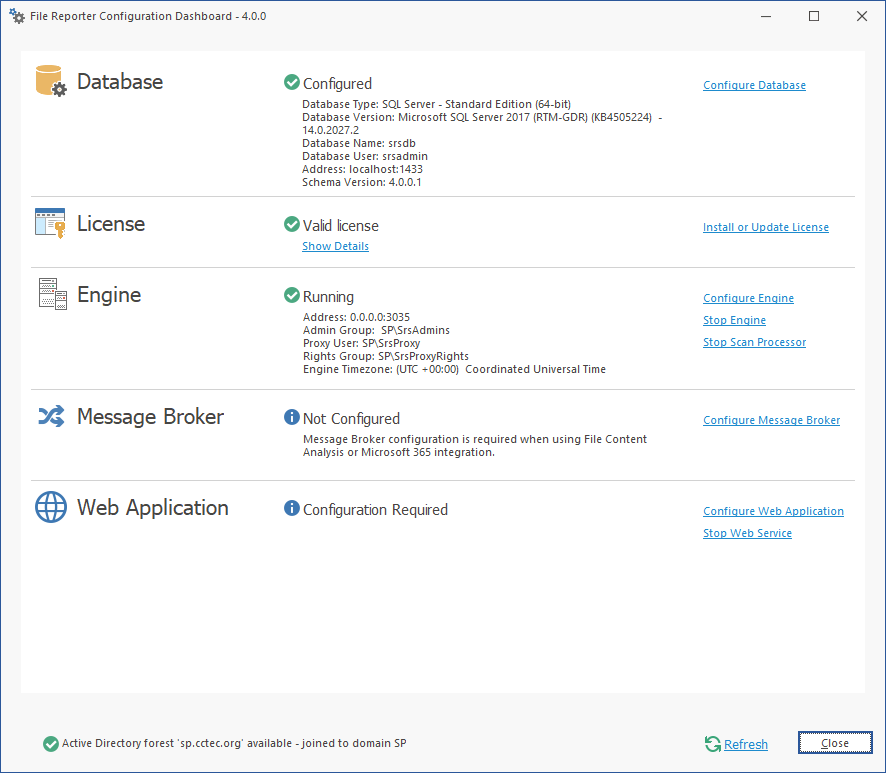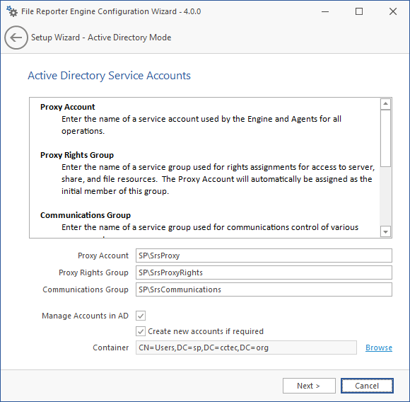 If you are upgrading from a previous version of File Reporter, the Proxy Account and Proxy Rights Group fields will specify the existing proxy account and proxy rights group.