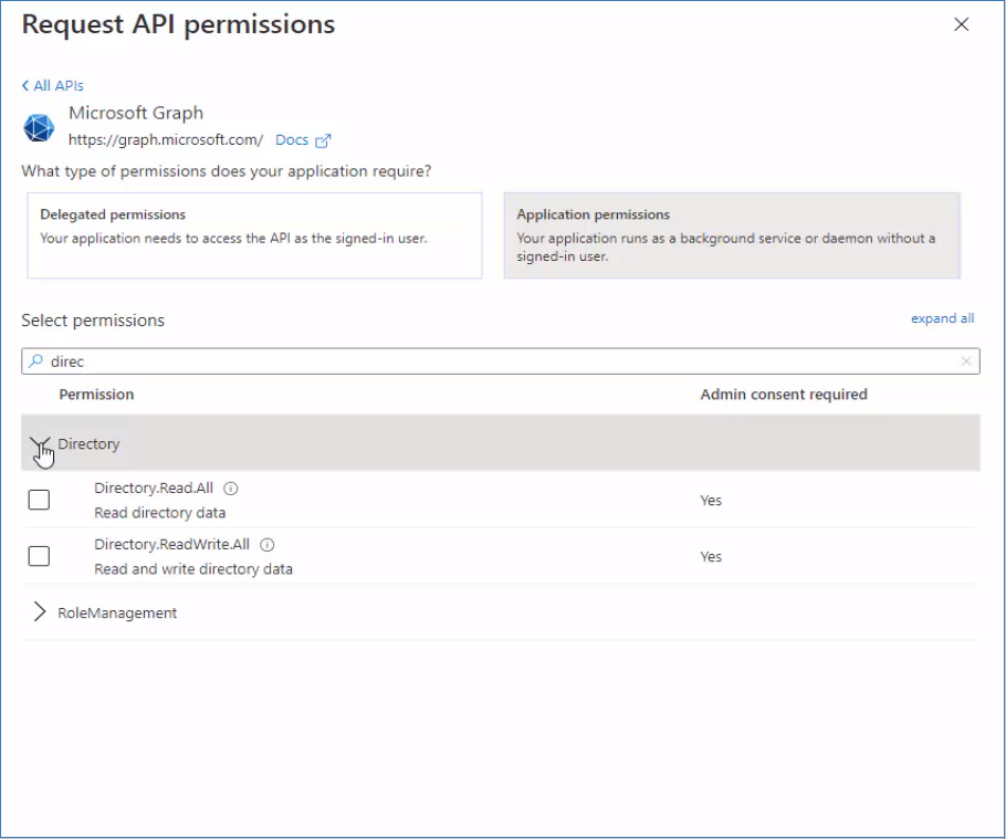 From the table in Substep 8a, verify that the permissions to select are Directory.Read.All Read directory data, then select that specific check box.