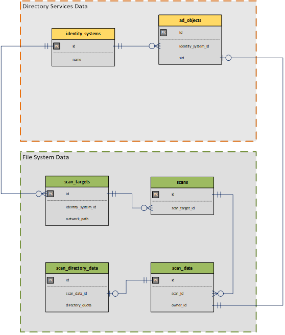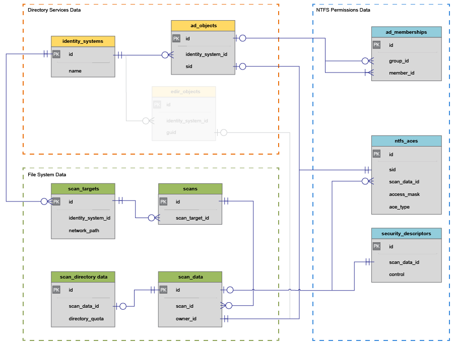 The collected scan data is generally broken down into three major areas: Identity System info, File System data, and Permissions data.
