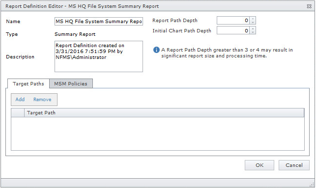 In the Initial Chart Path Depth field, specify the initial path depth for inclusion in the Top Ten Folders by Size chart that is displayed in the report header section.