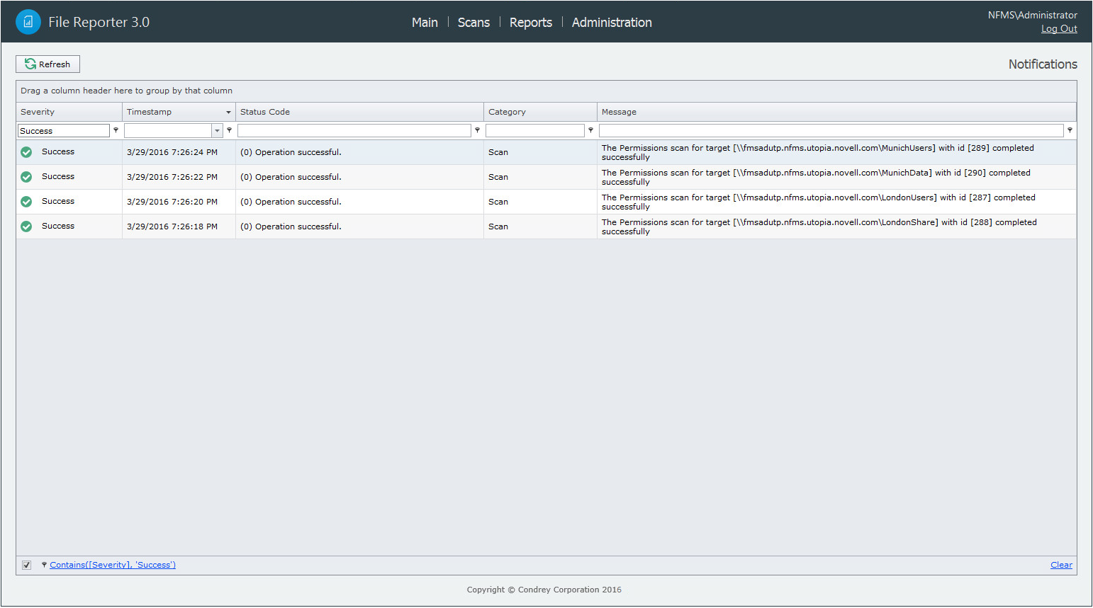 File Reporter displays notifications for successfully completed scans, failed scans, completed reports, failed reports, errors, warnings, and other information. You can use the filtering options to list only the notification types you want.