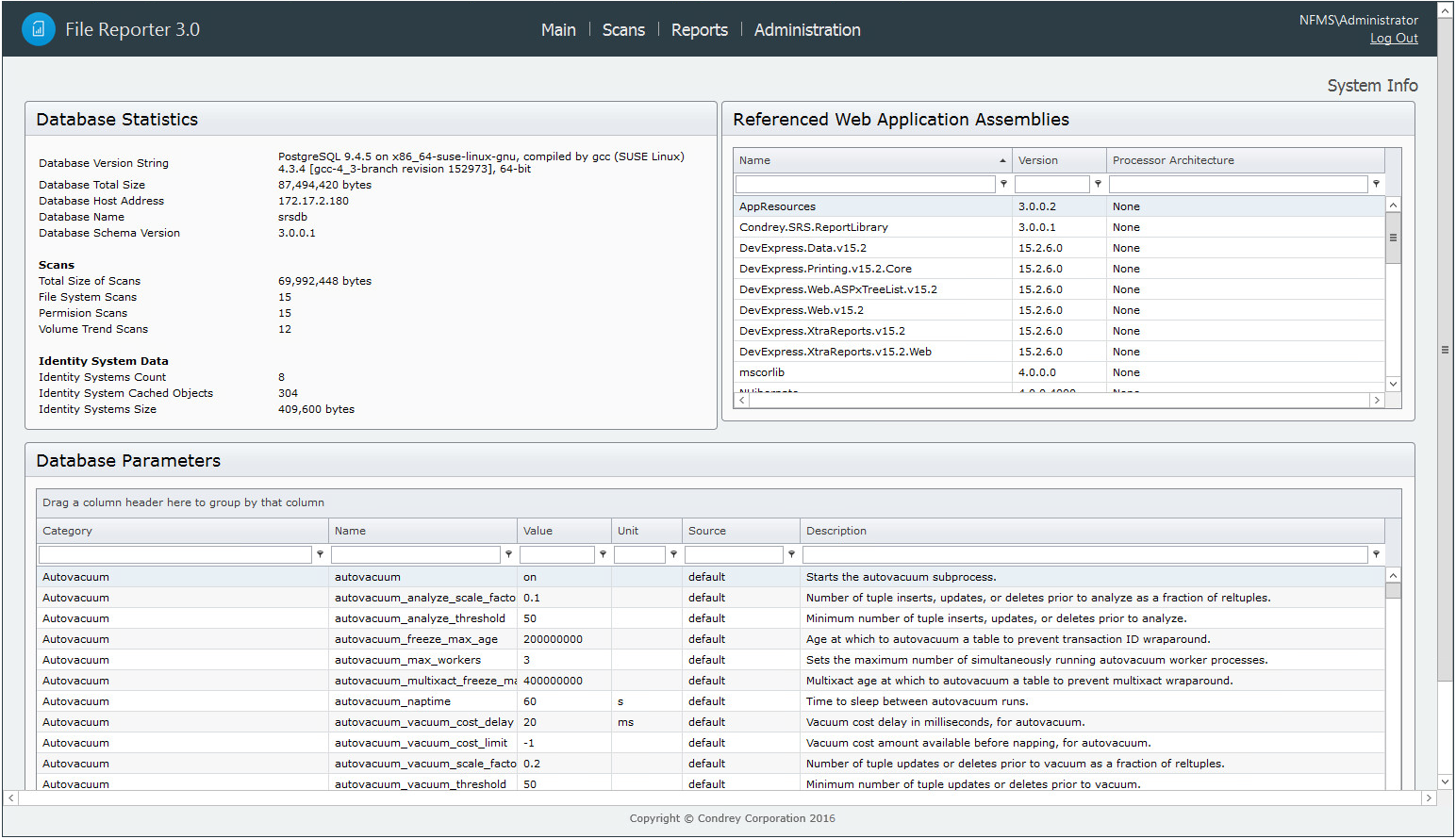 NOTE:The layout and content displayed in the System Info page varies between environments utilizing a PostgreSQL database and Microsoft SQL Server.