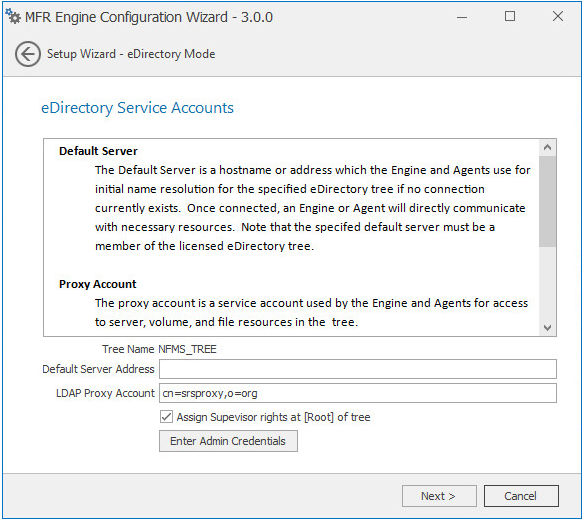 Specify the default server address, LDAP proxy account, and eDirectory LDAP credentials and click Next.