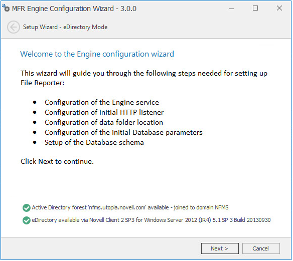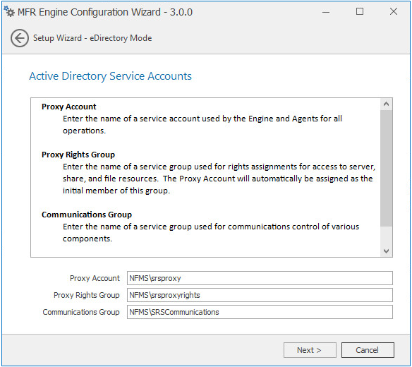 If you are upgrading from a previous version of File Reporter, the Proxy Account and Proxy Rights Group fields will specify the existing proxy account and proxy rights group such as nfrproxy and nfrproxyrights respectively.