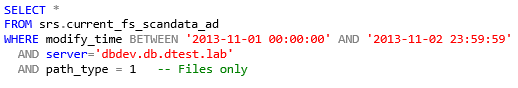This example selects all files on the specific server from November 1, 2013 midnight, through November 2, 2013 11:59 PM.