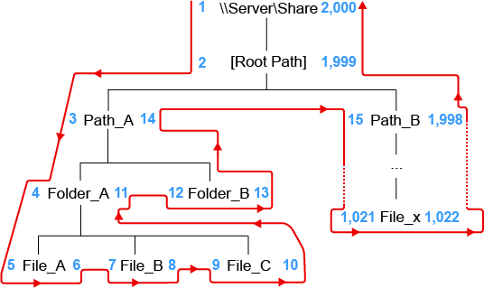 In the following diagram, an example of the nested set model calculations are shown with an example structure under \\Server\Share. In this example, exactly 1,000 file system entries exist, including files, folders, and the share itself.