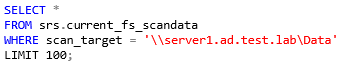 Example: Select file system data from a particular scan target (share or volume) limited to 100 entries.