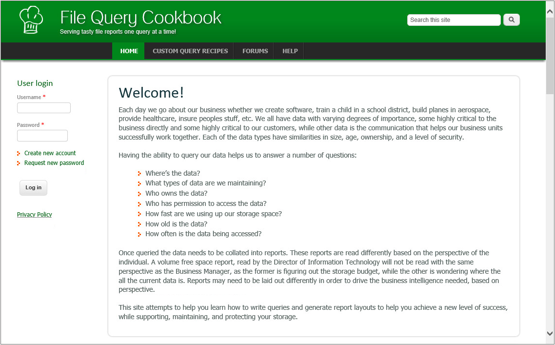 Access Online Templates: Click to directly access the list of all available Custom Query reports shared on the File Query Cookbook website. From the Custom Query Recipes page, you can filter your search by category, database host, and more.