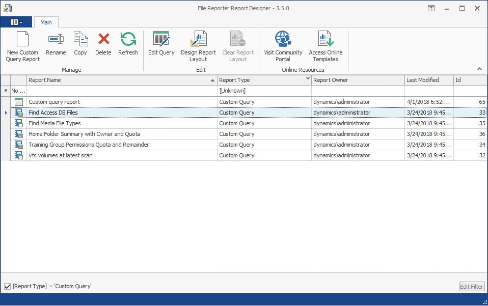Filter: The cell directly below the Report Name column heading is a report filter that lists saved Custom Query reports according what you enter. For example, if you were to enter the word access, the listed Custom Query reports would be only those with the word access in the report name.
