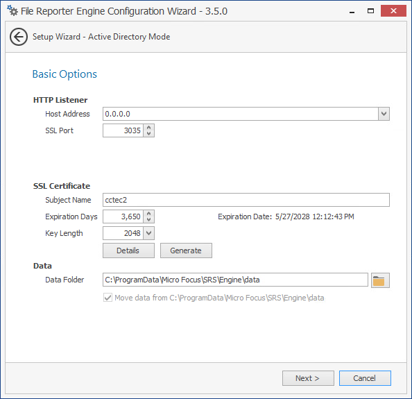 Move data from (Enabled only during an upgrade): Having this check box selected indicates that content from the Engine’s data folder for the previous version of File Reporter, will be moved to the path specified in the Data Folder field and the original path with be removed. If this check box is not selected, it will use whatever path is specified in the Data Folder field, including the original path.