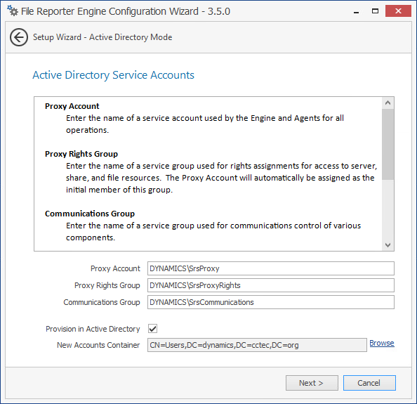 If you are upgrading from a previous version of File Reporter, the Proxy Account and Proxy Rights Group fields will specify the existing proxy account and proxy rights group such as nfrproxy and nfrproxyrights respectively.