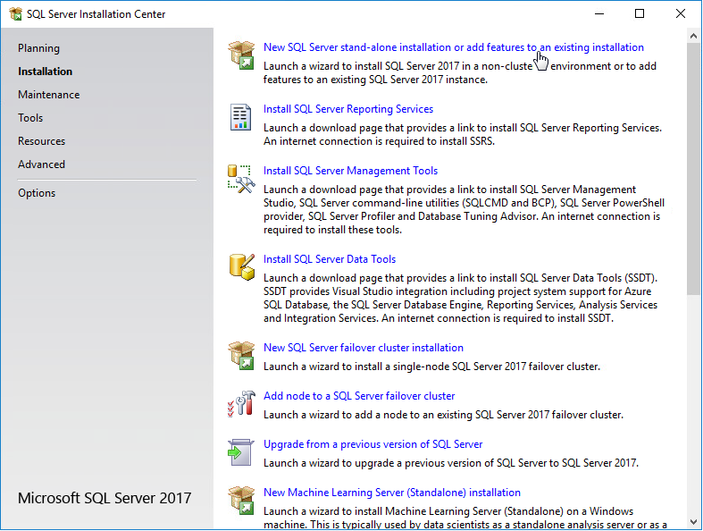Select New SQL Server stand-alone installation or add features to an existing installation.
