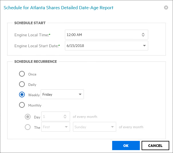 Be aware that entering a date does not mean that the report generates on that date. If the Engine Local Start Date is set for today, which is a Monday, but the Schedule Recurrence setting is set for Weekly on Sunday, the report does not generate until Sunday.