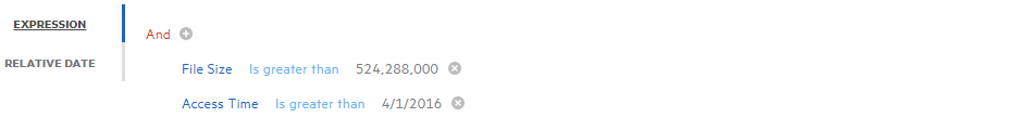 For example, in the example below, the files would appear in the report only if they were greater than 500 MB and had been accessed after April 1, 2012.