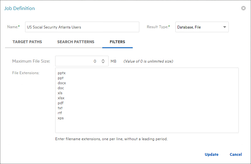 A job definition specifies the file system paths where the content scanning will take place, the search patterns that will be applied, the filters for the search, and where the content scanning results will be stored.
