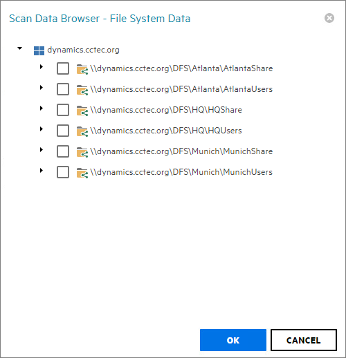 IMPORTANT:File paths appear in the Scan Data Browser - File System Data dialog box only if the paths have had a previous file system scan. If the path you want does not appear in the dialog box, you must first conduct a file system scan on the path.