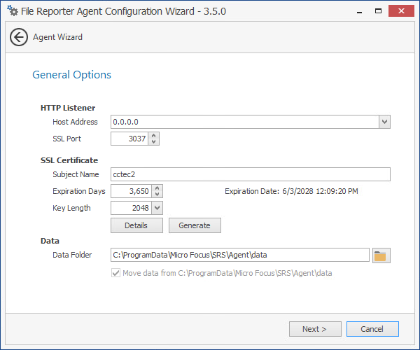 Move data from (Enabled only during an upgrade): Having this check box selected indicates that content from the Agent’s data folder for the previous version of File Reporter, will be moved to the path specified in the Data Folder field and the original path with be removed. If this check box is not selected, it will use whatever path is specified in the Data Folder field, including the original path.