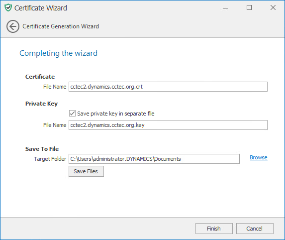 Target Folder: The default file path for the certificate and if specified, the private key. If you choose, you can modify the path.