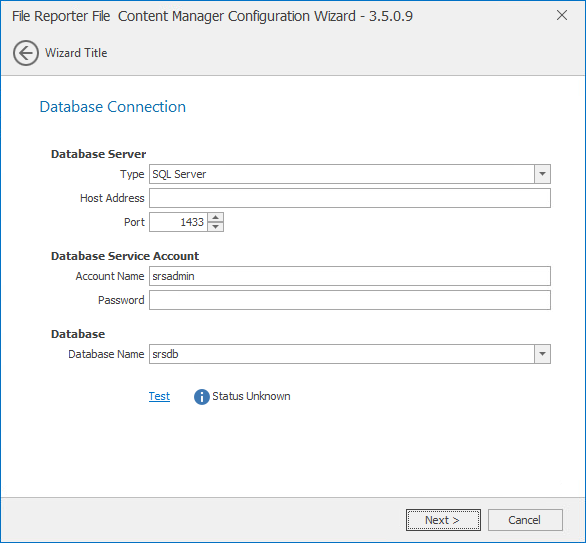 Account Name: This field specifies the database account name that is used by File Reporter to manage data in the database. This account has both read and write access to the database.