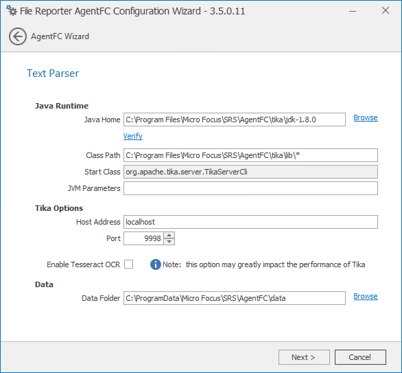 Host Address: The AgentFC communicates with Tika via the localhost, or the same computer where the AgentFC is being hosted. You should not adjust this setting.