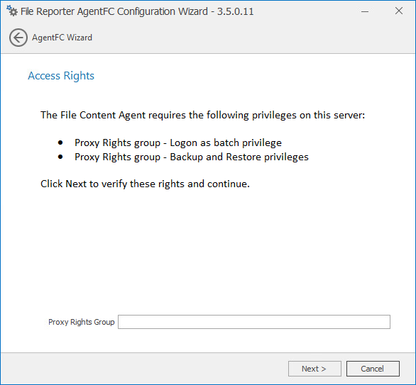 This page lets you establish needed privileges for the AgentFC host via the Proxy Rights Group.