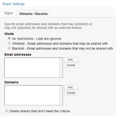 Blacklist: Select this option to disallow sharing with any email addresses and domains that have been specified in the Email addresses and Domains fields.
