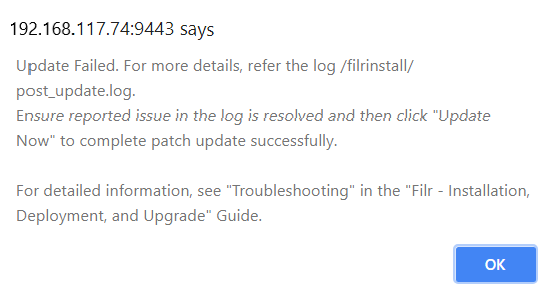 One of the reason for failure could be MySQL or Filr Search is down. You can refer to the logs at /filrinstall/post_update.log for more information.