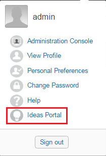 When you are logged in as an administrative user, you can access the Micro Focus Filr Ideas Portal page from the Port 8443 Filr Administration Console by clicking your user name and selecting the Ideas Portal link.
