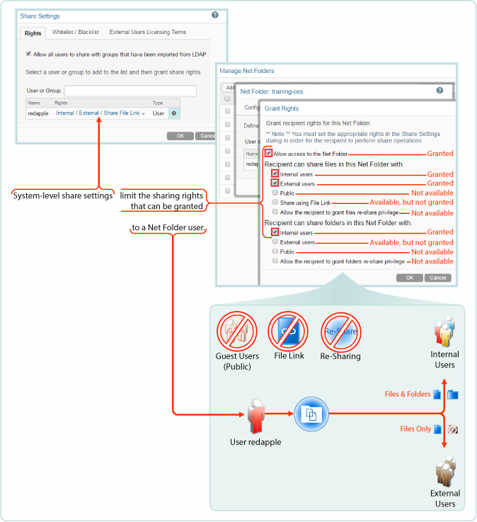 In Figure 12-3, user red can only be assigned sharing rights that are allowed at the system level.