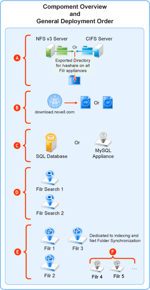 Figure 8-1 illustrates the general order for deploying Filr components. Letters reference brief component/process descriptions in the table that follows.