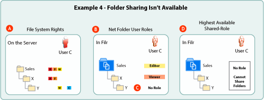 Because the lowest role that User C has in the Sales Net Folder is No Role, and because a shared-access role assignment must be made when sharing a folder, User C cannot share the Sales Net Folder. The same restriction would apply to attempts to share folder X.