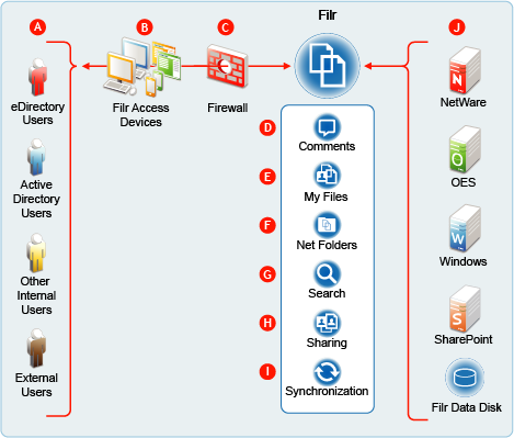 Figure 1-3 shows Filr’s main features in the context of your existing network infrastructure. The table that follows the figure briefly describes each feature and how all of the components shown fit together to provide Filr services.