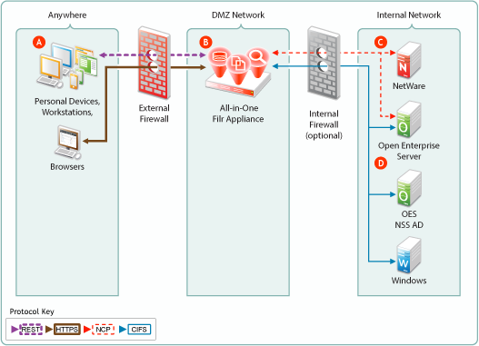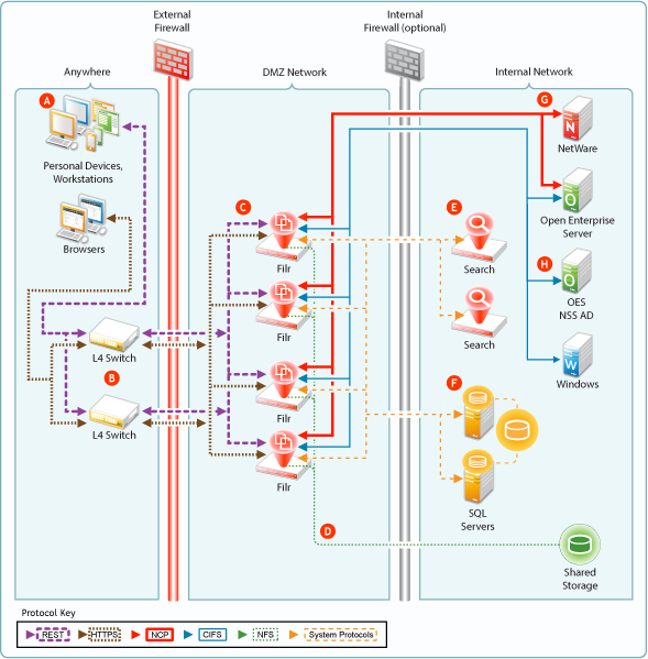 You can deploy Filr appliances inside a front-end DMZ and configure multiple Filr VAs to share NFS- of CIFS-based storage (D), thus providing scalability and high availability. |