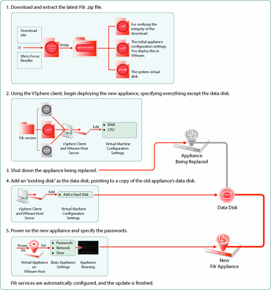 in the Filr 3.4: Installation, Deployment, and Upgrade Guide. A successful upgrade depends on following sub-tasks that are not illustrated here, such as the order in which appliances are shut down and then restarted.
