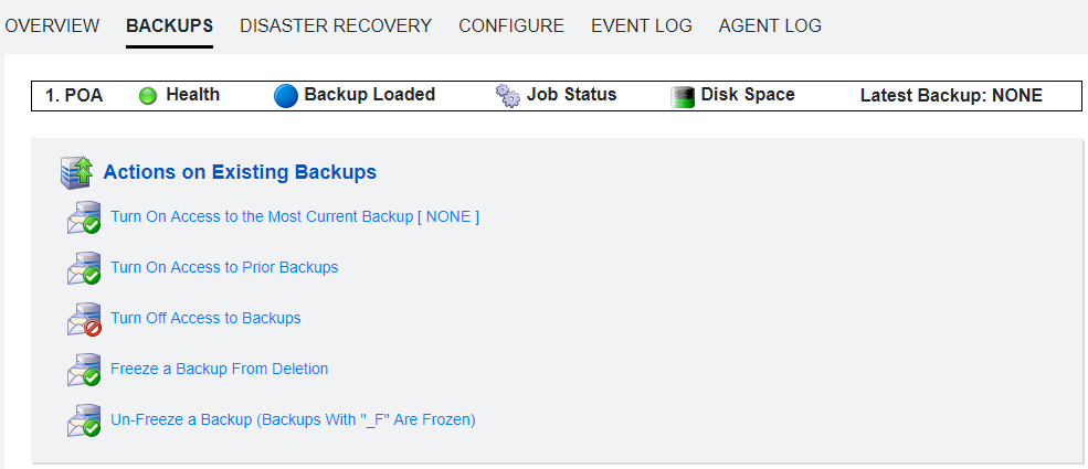 From the Actions of Existing Backups, select Turn On Access to the Most Current Backup or Turn on Access to Prior Backups.