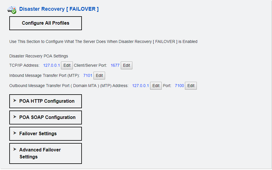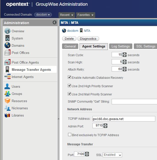 Confirm that the Message Transfer Port is specified with the default 7101. MTP communication is not only a faster means of communication between MTAs and POAs, but it is essential to disaster recovery purposes. If the Message Transfer Port is different, that will need to be entered into GroupWise Disaster Recovery later on.