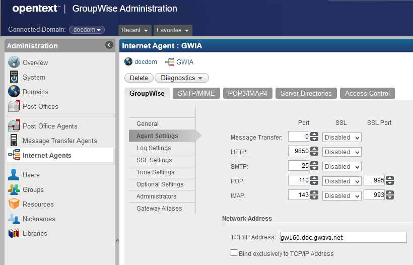 In the Groupwise Administration Console, navigate to > Message Transfer Agents > selected MTA > Agent Settings > Network Address > Host Name.